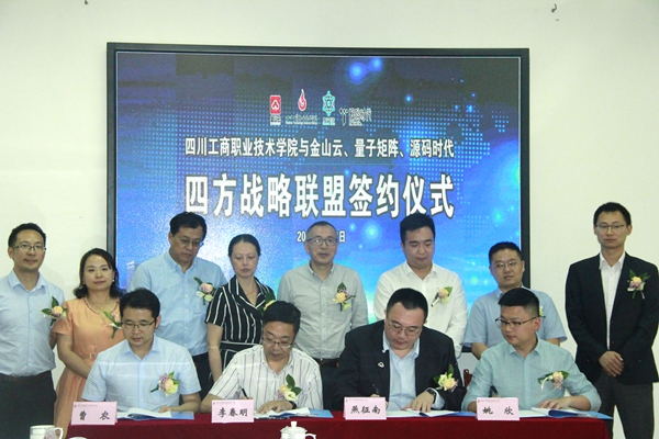7月2日下午,我校与金山云、量子矩阵、源码时代四方战略联盟签约仪式在学校第三会议室举行。北京金山云网络技术有限公司金融战略事业部总经理燕征南,金山云大数据产品线总监钟爽;Micro Focus软件集团中国区高级顾问、金山云高级顾问赵国帅;量子矩阵技术支持经理曹农,源码时代CEO姚欣,源码时代联合创始人蔡世友,学校党委副书记、院长李春明,副院长邓春生,信息工程系负责人及各教研室主任出席本次仪式。