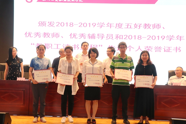 大会举行了新教师入职宣誓仪式,通报了学校荣获上级组织表彰的先进集体和先进个人名单,对荣获学校2018-2019学年度“五好教师”“优秀教师”“优秀辅导员”和“教职工读书工程”先进个人荣誉称号的教职工进行了表彰,并颁发了荣誉证书。会上,全国优秀教师、学校思政部副教授蔡小丽老师传达了省委省政府庆祝第35个教师节座谈会精神,分享了工作经验和体会;先进教师代表罗莉副教授作了发言,学生代表周宇驰致贺词。