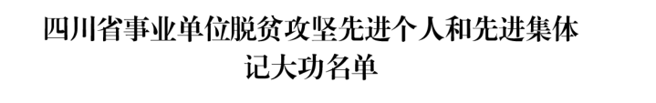 12月14日,四川省人力资源和社会保障厅、中共四川省直属机关工作委员会、四川省扶贫开发局联合发布《关于给予全省事业单位脱贫攻坚先进个人和先进集体记大功的决定》(川人社发〔2020〕30号),根据国家统一部署,按照四川省人力资源和社会保障厅、中共四川省直属机关工作委员会、四川省扶贫开发局《关于在全省事业单位集中开展脱贫攻坚专项奖励的通知》相关要求,对我省事业单位在执行党和国家关于脱贫攻坚重大战略部署中,表现突出、成绩显著的工作人员和集体进行记大功奖励。这次表彰的单位共有53个,我校名列被表彰的5个省级部门之一。