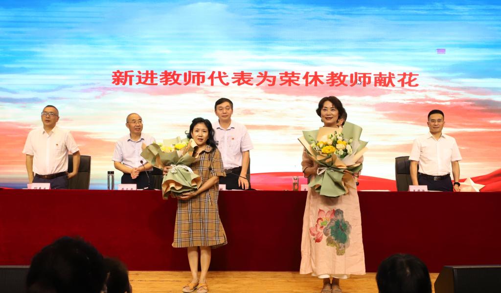 会上,举行了荣休教师离职致敬暨新教师入职宣誓仪式,全体参会者向在教育战线奋斗了几十年的离退休老教师致敬,新进教师代表为荣休教师献花。对今年新进的39名教师进行了教师入职宣誓,全体与会教师重温了教师入职誓词。荣休教师代表李艳和新教师代表、机电工程系向代阳分别作了发言。