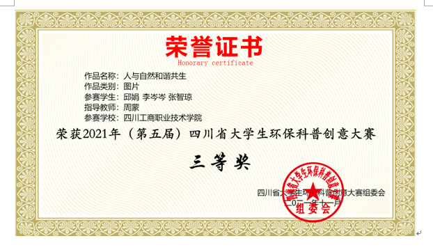 近日,由四川省教育厅主办,西华师范大学、四川省环境科学学会承办的2021年(第五届)四川省大学生环保科普创意大赛圆满落幕。本次大赛共有48所高校631件作品参赛,本专科院校同台较量,经审核、初赛以及决赛,我校推选的4件作品获得一等奖1项、三等奖3项,环境工程技术专业张林教师获评优秀指导教师。
