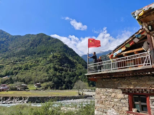 驻村队员走遍村里的每一条山路小径,在村头巷尾等显著位置,和村民们共同插上一面面国旗,鲜艳的五星红旗在高原蓝天下高高飘扬,把湛蓝的天空装点得分外绚丽。此刻,“中国红”点亮了一座座藏乡村寨,点燃了一颗颗火热的爱国心。