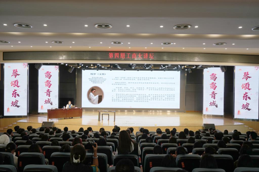 为深入学习贯彻习近平文化思想,大力弘扬传承中华优秀传统文化,丰富师生校园文化生活,推动“礼敬中华优秀传统文化”宣传教育活动走深走实,10月10日,由学校党委宣传部主办、校团委协办的工商大讲坛第四期“霭霭青城琴颂东坡”主题讲座在多功能二厅开讲,特别邀请四川省古琴学会、草堂美思文化传习院主理人文熙和成都民俗文化研究会常务理事、锦江区地方志编纂办研究员胡日森担任主讲嘉宾。学校党委常委、工会主席王银桃,党委常委、党委宣传部部长周婷出席活动。学校相关部门负责人,轻风文学社以及各二级学院师生共400余人参加活动。