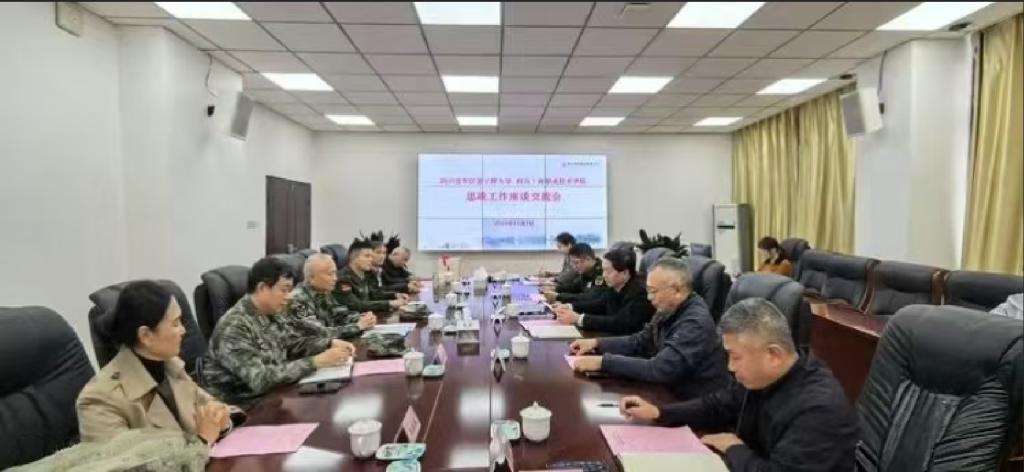 11月7日,四川省军区老干部大学校长郑道光一行到校调研指导,开展精神文明共建合作,并为我校师生上了一堂别开生面、催人奋进的特色思政课——《红色家书》情景剧汇演。我校党委书记管永林主持座谈会,党委副书记、院长邓春生和都江堰市市委常委、武装部政委陈荣长等出席座谈会。省军区老干部大学办公室、诗书画教研室、文艺教研室等部门负责同志,我校党委常委、纪委书记向晓岚,党委常委、副院长聂文俊,党委常委、工会主席王银桃,党委常委、宣传部部长周婷和相关部门负责人、师生代表近500人观看了情景剧。