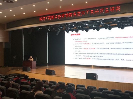 7月9日下午,都江堰市市场和监督管理局餐饮服务科王建明同志,在校学术报告厅对我校总务处员工和食堂员工开展了食品卫生安全知识培训,总务处食堂管理人员、都江堰市市场和监督管理局聚源分局、崇义市场和监督管理所工作人员也参加了此次培训。王老师从食品安全管理制度的建立健全执行、关键环节把关、加工到场所设备设施的配备及留样要求、晨检记录、食品采购台账资料档案的管理等方面进行了细致的讲解。
