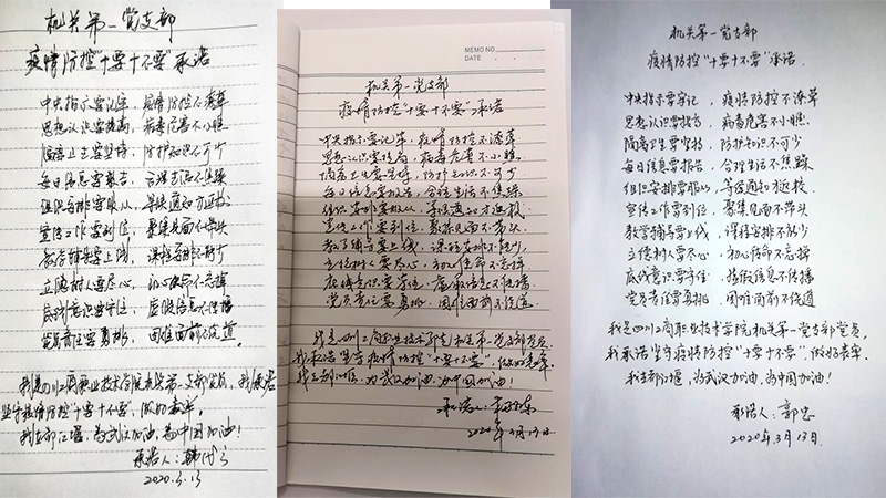 当前新型冠状病毒感染肺炎疫情防控正处于关键期,疫情形势依然复杂严峻,机关第一党支部开展疫情防控“十要十不要”承诺活动,要求每位党员于党日活动前,手抄一份“十要十不要”承诺书,并上传至支部QQ群,号召支部全体党员,提高思想认识,坚守底线意识,为坚决打赢疫情防控人民战争、总体战、阻击战贡献力量。
