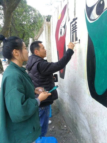 11月15至16日,由学工党支部牵头,学工党支部纪检委员吴勇带领我校学生参与志愿服务活动,将廉洁文化宣传送进社区,为都江堰市安顺社区、安青社区的公共墙体绘制艺术图案。