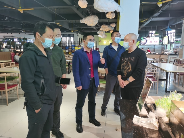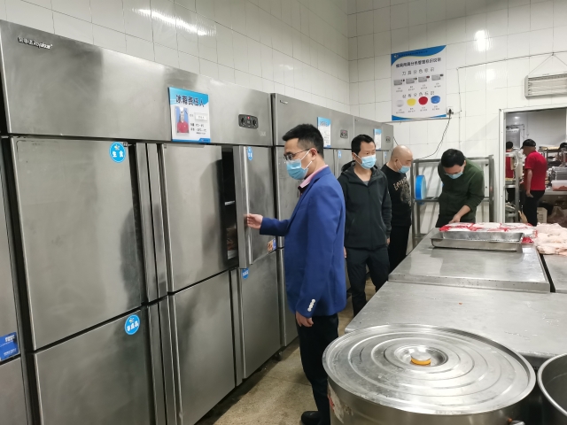 王开淮一行深入食堂后厨操作间、冷藏区、库房、值班室等区域,逐一查看环境卫生情况、人员规范操作情况,以及食材的储备、放置和保质情况,并仔细查阅了食堂进货记录、消毒记录等资料。