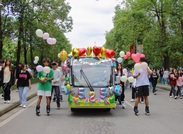 上午的放学铃一敲响,被横幅、气球、拉花、流苏装饰一新的“花车”在轮滑协会的护送下,从2A教学楼一侧校园主干道缓缓驶出,吸引了校园内刚放学的师生们在路旁驻足观赏。